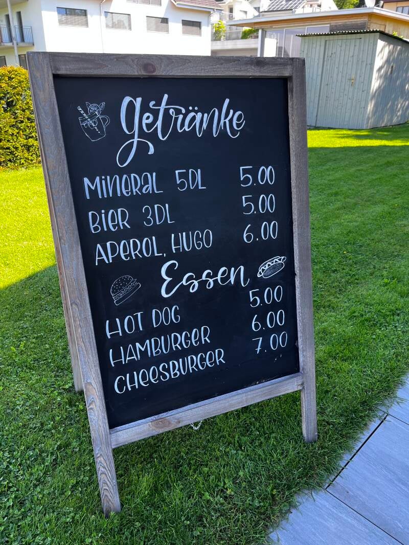 Gerne beschrifte ich Eure Tafeln oder Kundenstopper. Witterungsbeständig. Sei es für Gastronomie, privat, Hochzeit, Geburtstag, Firmenanlass, Jubiläum etc.